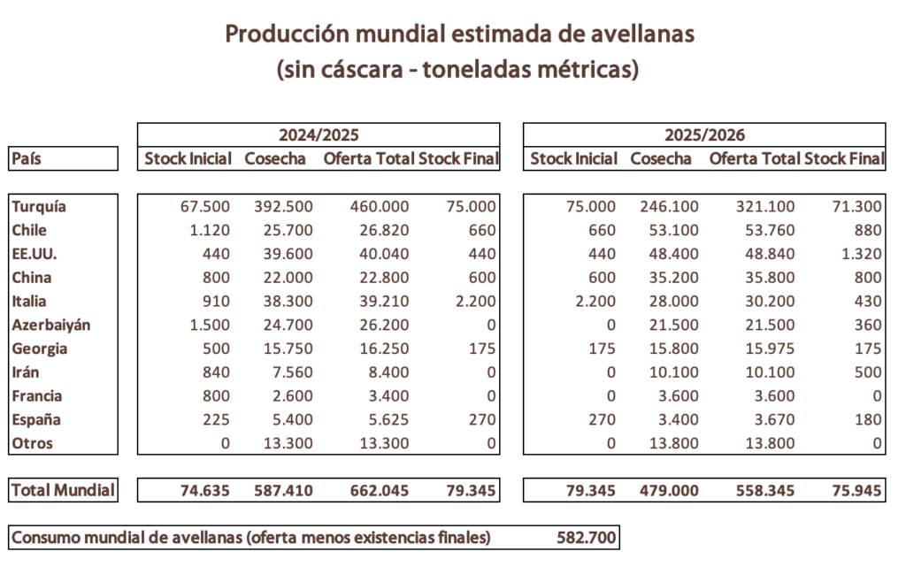 Turquía, principal productor mundial de avellanas, estima su cosecha 2025/26 en 528.000 toneladas métricas con cáscara, con un rendimiento de fruta entre 47-48%. Tras considerar pérdidas adicionales por descascarado, la cifra ajustada podría ubicarse en torno a las 518.000 TM.